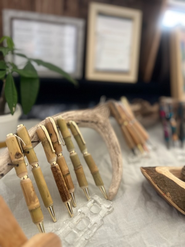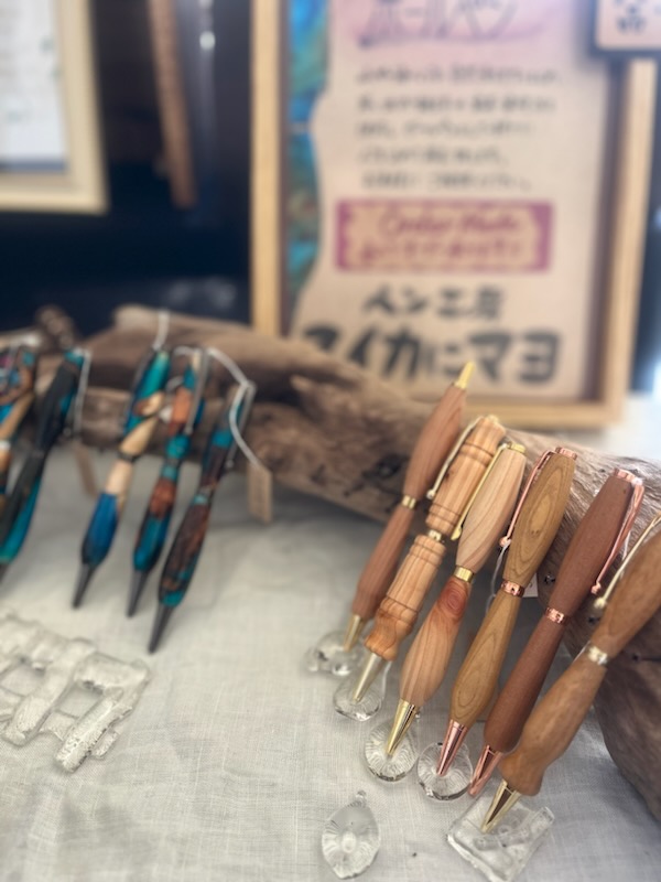 あたたかみのあるボールペンが並ぶスイカにマヨさんのブース。